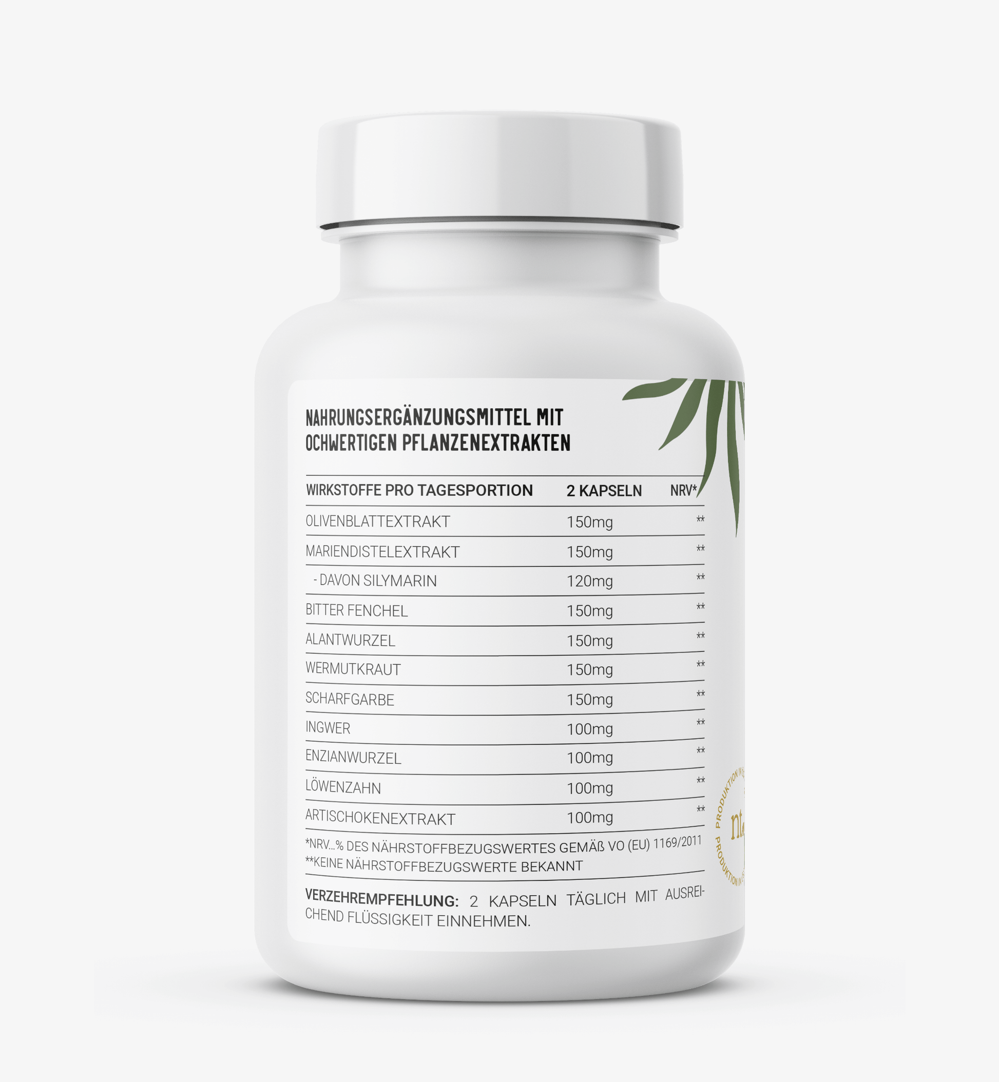 Olivenblattextrakt, Mariendistelextrakt, Bitter Fenchel, Hydroxypropylmethylcellulose (Kapselhülle), Wermutkraut, Schafgarbe, Alantwurzel, Löwenzahn, Ingwer, Artischockenextrakt, Enzianwurzel